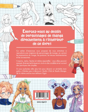 Ce cahier d’exercices vous propose de vous entraîner à reproduire une vingtaine de personnages de manga, en variant les expressions du visage, les postures, les tenues vestimentaires et les accessoires. Crayons, stylos, feutres et même aquarelles : vous allez pouvoir essayer diverses techniques en vis-à-vis des modèles et en suivant des pas-à-pas très simples. Si vous souhaitez aller plus loin pour devenir un véritable mangaka, n’hésitez pas à découvrir Studio Chibi et Studio Manga, de la même autrice aux éditions Vigot.