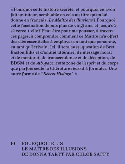 Ici, il sera aussi question de Bret Easton Ellis et d’amitié littéraire, de message moral et de mentorat, de transcendance et de déception, de BDSM et de subspace, cette zone de l’esprit et du corps que parfois seule la littérature réussit à formuler. Une autre forme de Secret History. »