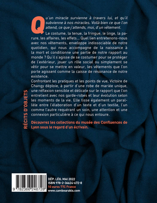 Qu'un miracle survienne à travers lui, et qu'il subvienne à nos miracles. Voilà bien ce que l'on attend, ce que j'attends, moi, d'un vêtement. Le costume, la tenue, la fringue, le linge, la parure, les affaires , les effets... Quel lien entretenons-nous avec nos vêtements, enveloppe indissociable de notre quotidien, qui nous accompagne de la naissance à la mort et conditionne une partie de notre rapport au monde ? Qu'il s'agisse de se costumer pour se protéger de l'extérieur, jouer un rôle social ou simplement se vêtir pour se mettre en valeur, les vêtements que l'on porte agissent comme la caisse de résonance de notre existence. Confrontant les pratiques et les points de vue, Victoire de Changy déploie, à partir d'une robe de mariée unique, une réflexion sensible et délicate sur le rapport que l'on entretient avec nos garde-robes et leur évolution selon les moments de la vie. Elle tisse également un parallèle entre l'élaboration d'un texte et d'un textile, l'un comme l'autre requérant un soin, une attention et une connexion particulière à ce qui nous entoure.