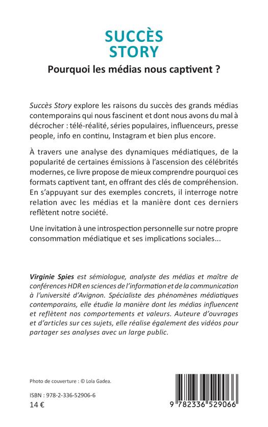 Succès Story explore les raisons du succès des grands médias contemporains qui nous fascinent et dont nous avons du mal à décrocher: télé-réalité, séries populaires, influenceurs, presse people, info en continu, Instagram et bien plus encore. À travers une analyse des dynamiques médiatiques, de la popularité de certaines émissions à l'ascension des célébrités modernes, ce livre propose de mieux comprendre pourquoi ces formats captivent tant, en offrant des clés de compréhension. En s'appuyant sur des exemples concrets, il interroge notre relation avec les médias et la manière dont ces derniers reflètent notre société. Une invitation à une introspection personnelle sur notre propre consommation médiatique et ses implications sociales...