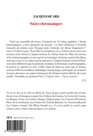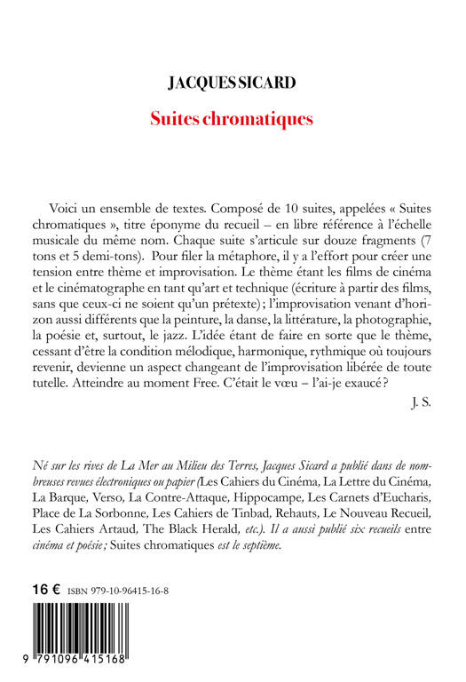 Jacques Sicard commence à être connu dans un certain milieu critique (CCP du cipM, Artpress, lelitteraire.com, La Cause littéraire, etc.) pour ses textes courts (une page ou deux), entre image et texte, sur des photogrammes de film, une photographie, une peinture, un morceau de jazz, un livre, etc. C'est la vision (ou lecture) d'une oeuvre d'art qui déclenche chez lui le désir d'écriture. Il a été qualifié de « plus mallarméen » des écrivains vivants par Guillaume Basquin (in Artpress)... Jamais encore il n'avait composé un volume en le pensant dès le départ dans sa complétude, son entièreté musicale, comme une symphonie ou une cantate : une suite : ces Suites chromatiques. Voici l'auto-présentation du livre par son auteur : "Voici un ensemble de textes. Composé de 10 suites, appelées Suites chromatiques, titre éponyme du recueil - en libre référence à l'échelle musicale du même nom. Chaque suite s'articule sur douze fragments (7 tons et 5 demi-tons)."