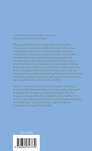 Journal de bord de sa maladie, entre l'angoisse de mourir et le bonheur nostalgique de se souvenir, la littérature apparaît comme un refuge salutaire. Texte lumineux et poignant. Wofgang Herrndorf est un jeune auteur important à l'oeuvre inachevée.