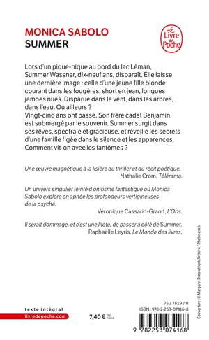 Lors d'un pique-nique au bord du lac Léman, Summer Wassner, dix-neuf ans, disparaît. Elle laisse une dernière image : celle d'une jeune fille blonde courant dans les fougères, short en jean, longues jambes nues. Disparue dans le vent, dans les arbres, dans l'eau. Ou ailleurs ?Vingt-cinq ans ont passé. Son frère cadet Benjamin est submergé par le souvenir. Summer surgit dans ses rêves, spectrale et gracieuse, et réveille les secrets d'une famille figée dans le silence et les apparences. Comment vit-on avec les fantômes ?Une oeuvre magnétique à la lisière du thriller et du récit poétique. Nathalie Crom, Télérama.Un univers singulier teinté d'onirisme fantastique où Monica Sabolo explore en apnée les profondeurs vertigineuses de la psyché. Véronique Cassarin-Grand, L'Obs.Il serait dommage, et c'est une litote, de passer à côté de Summer. Raphaëlle Leyris, Le Monde des livres.