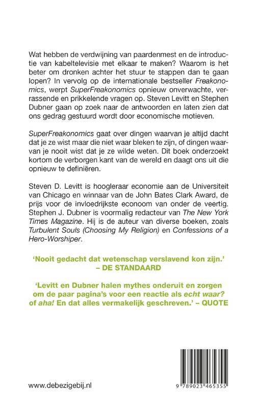 Wat hebben de verdwijning van paardenmest en de introductie van kabeltelevisie met elkaar te maken? Waarom is het beter om dronken achter het stuur te stappen dan te gaan lopen? In vervolg op de internationale bestseller Freakonomics, werpt SuperFreakonomics opnieuw onverwachte, verrassende en prikkelende vragen op. Steven Levitt en Stephen Dubner gaan op zoek naar de antwoorden en laten zien dat ons gedrag gestuurd wordt door economische motieven. Of het nu gaat om prostituees, zelfmoordterroristen, klimaatdeskundigen of artsen: zij worden uiteindelijk allemaal gedreven door economische prikkels. SuperFreakonomics gaat over dingen waarvan je altijd dacht dat je ze wist maar die niet waar bleken te zijn, of dingen waarvan je nooit wist dat je ze wilde weten. Dit boek onderzoekt kortom de verborgen kant van de wereld en daagt ons uit die opnieuw te definiëren.