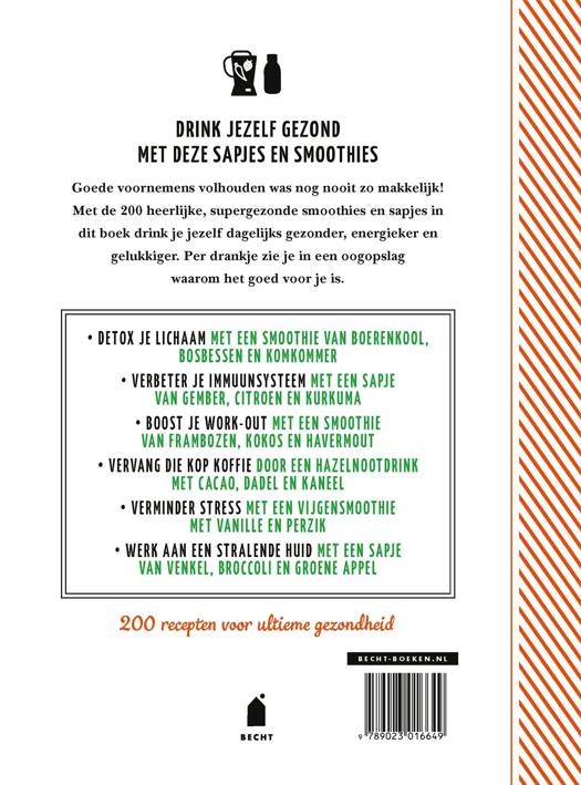 Goede voornemens volhouden was nog nooit zo makkelijk! Met de 200 heerlijke, supergezonde smoothies en sapjes in dit boek drink je jezelf dagelijks gezonder, energieker en gelukkiger. Per drankje zie je in een oogopslag waarom het goed voor je is. Verbeter je immuunsysteem met een sapje van munt en matcha, detox je lichaam met een smoothie van boerenkool, bosbessen en komkommer, vervang die kop koffie door een hazelnootdrink met cacao, dadel en kaneel en werk aan een stralende huid met een sapje van venkel, broccoli en groene appel. Voor dit boek zijn de beste recepten uit Groene sapjes, Nog meer groene sapjes, Sport- en energiedrankjes en Power drinks gebundeld.