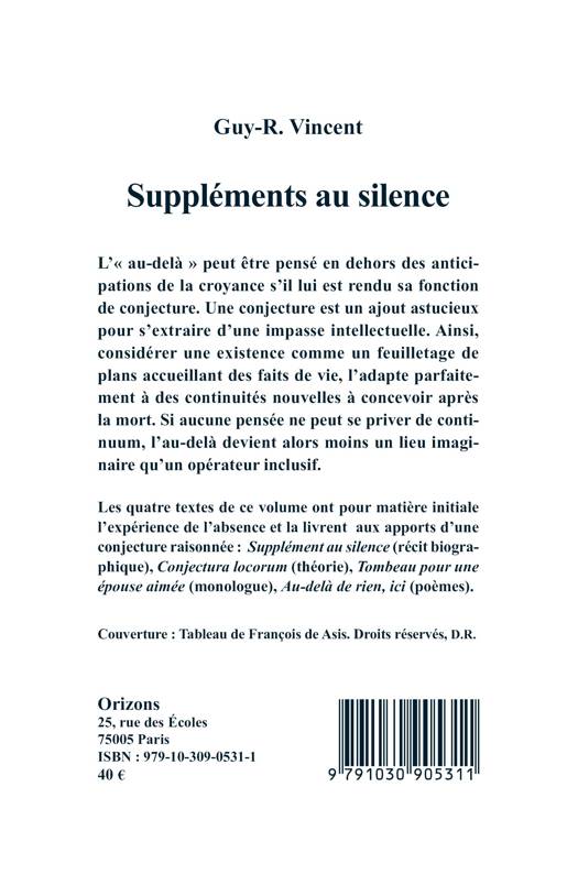 L' au-delà peut être pensé en dehors des anticipations de la croyance s'il lui est rendu sa fonction de conjecture. Une conjecture est un ajout astucieux pour s'extraire d'une impasse intellectuelle. Ainsi, considérer une existence comme un feuilletage de plans accueillant des faits de vie, l'adapte parfaitement à des continuités nouvelles à concevoir après la mort. Si aucune pensée ne peut se priver de continuum, l'au-delà devient alors moins un lieu imaginaire qu'un opérateur inclusif. Les quatre textes de ce volume ont pour matière initiale l'expérience de l'absence et la livrent aux apports d'une conjecture raisonnée: "Supplément au silence" (récit biographique), "Conjectura locorum" (théorie), "Tombeau pour une épouse aimée" (monologue), "Au-delà de rien, ici" (poèmes).