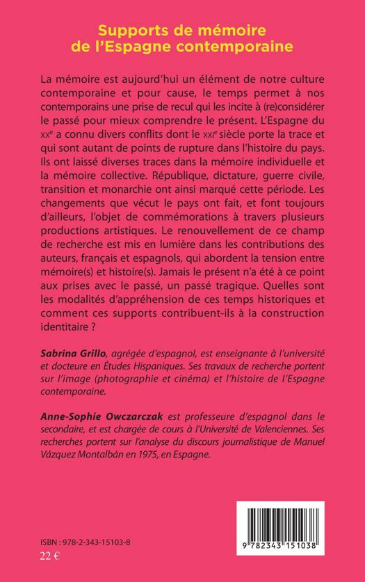 L'Espagne du XXe siècle a connu divers conflits qui sont autant de points de rupture dans l'histoire du pays.Ils sont laissé diverses traces dans les mémoires individuelle et collective. Les changements que vécut le pays ont fait et font toujours l'objet de commémorations à travers des productions artistiques. Ces contributions françaises et espagnoles abordent la tension entre mémoire(s) et histoire(s). Quelles sont donc les modalités d'appréhension de ces temps historiques et comment ces supports contribuent-ils à la construction identitaire ? (Articles en français et en espagnol)