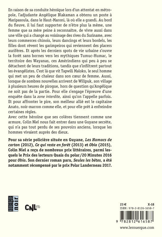 En raison de sa conduite héroïque lors d'un attentat en métropole, l'adjudante Angélique Blakaman a obtenu un poste à Maripasoula, dans le Haut-Maroni, là où elle a grandi. Au bord du fleuve, il lui faut supporter de n'être plus la même, une femme que sa mère peine à reconnaître, de vivre aussi dans une ville qui a changé au voisinage des rives du Suriname, avec leurs commerces chinois, leurs dancings et leurs bordels, les filles dont rêvent les garimpeiros qui reviennent des placers aurifères. Et après les derniers spots de vie urbaine s'ouvre la forêt sans bornes vers les mythiques Tumuc-Humac, le territoire des Wayanas, ces Amérindiens qui peu à peu se détachent de leurs traditions, tandis que s'infiltrent partout les évangélistes. C'est là que vit Tapwili Maloko, le seul homme qui met un peu de chaleur dans son coeur de femme. Aussi, lorsque de sombres nouvelles arrivent de Wïlïpuk, son village à plusieurs heures de pirogue, hors de question qu'Angélique ne soit pas de la partie. Pour elle s'engage l'épreuve d'une enquête dans la zone interdite, ainsi qu'on l'appelle parfois. Et pour affronter le pire, son meilleur allié est le capitaine Anato, noir-marron comme elle, et pour elle prêt à enfreindre certaines règles. Avec cette héroïne que ses colères tiennent comme une armure, Colin Niel nous fait entrer dans une Guyane secrète, qui n'a pas tout perdu de ses pouvoirs anciens, lorsque les hommes vivaient auprès des dieux.