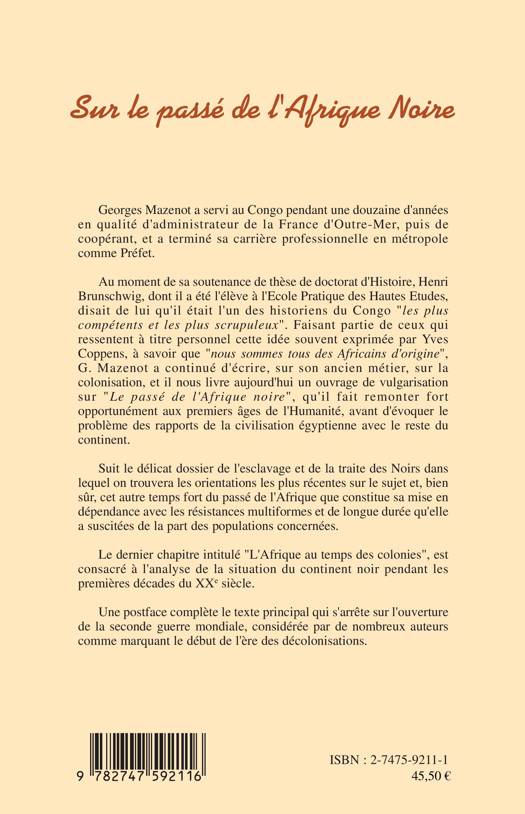 G. Mazenot nous livre ici un ouvrage de vulgarisation sur "le passé de l'Afrique noire" qu'il fait fort opportunément remonter aux premiers âges de l'Humanité, avant d'évoquer le problème des rapports de la civilisation égyptienne avec le reste du continent. Suit le délicat dossier de l'esclavage et de la traite des Noirs et cet autre temps fort du passé de l'Afrique que constitue sa mise en dépendance avec les résistances qu'elle a suscitées de la part des populations concernées. Le dernier chapitre est consacré à l'analyse de la situation du continent noir pendant les premières décades du XXè siècle.