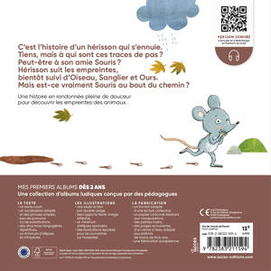 LES PLUS • Des textes courts autour des animaux et des empreintes • Des illustrations épurées pleines de douceur réalisées par Cécile Hudrisier • Un QR Code pour écouter la lecture de l’album • Une fabrication de qualité, solide et résistante aux petites mains ! • Un livre adapté à la lecture adulte-enfant pour un moment privilégié • Une conception éthique et engagée