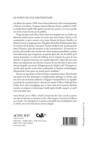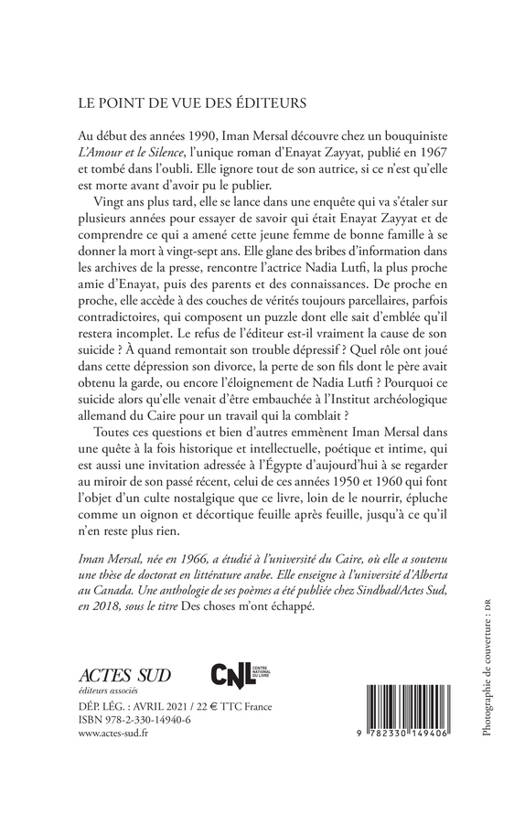 Au début des années 1990, Iman Mersal découvre chez un bouquiniste «L'Amour et le Silence», l'unique roman d'Enayat Zayyat, publié en 1967 et tombé dans l'oubli. Elle ignore tout de son autrice, si ce n'est qu'elle est morte avant d'avoir pu le publier.