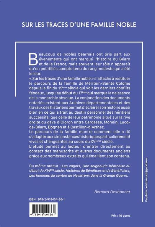 Beaucoup de nobles béarnais ont pris part aux événements qui ont marqué l’histoire du Béarn et de la France. Souvent, leur rôle n’apparait qu’en pointillés compte tenu du rang modeste qui a été le leur. « Sur les traces d’une famille noble » s’attache à restituer le parcours de la famille de Méritein Sainte Colome depuis la fin du 15ème siècle qui voit la fin des derniers conflits féodaux, jusqu’au début du 17ème qui marque la naissance de la monarchie absolue. La conjonction des documents notariés existants aux Archives des Pyrénées Atlantiques et des travaux des historiens permet d’éclairer son histoire, aussi bien concernant le destin personnel des héritiers successifs, que celle de leur patrimoine situé sur la rive droite du gave d’Oloron, entre Cardesse, Monein, Lucq-de-Béarn, Dognen et Castillon d’Arthez. Le parcours de la famille montre comment elle a dû s’adapter aux circonstances historiques particulièrement vives et changeantes au cours du 16ème siècle. L’étude permet au lecteur d’entrer directement au contact des manuscrits et autres documents anciens grâce aux nombreux extraits qui émaillent son contenu.