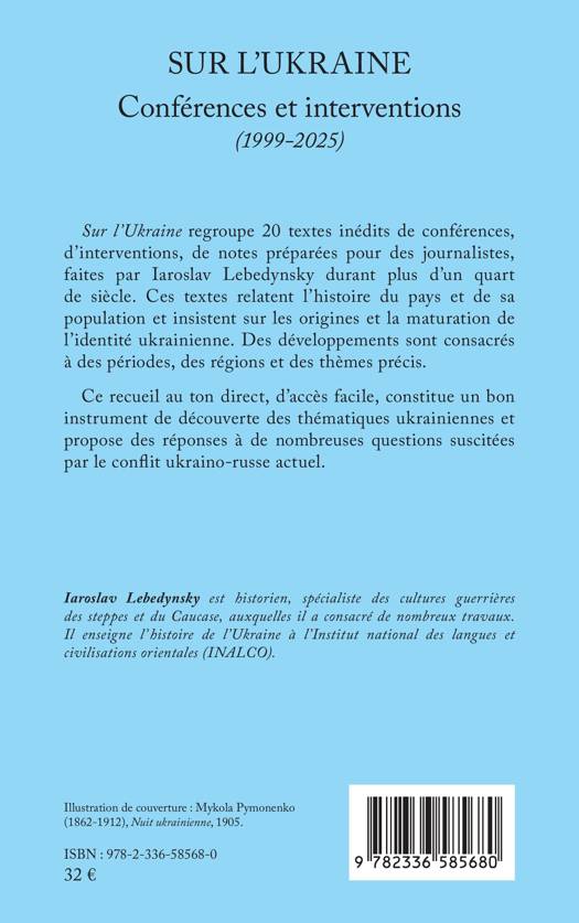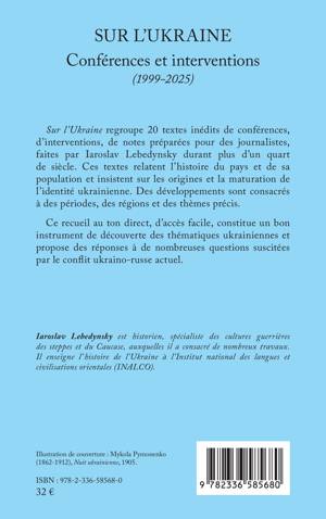 Sur l'Ukraine regroupe 20 textes inédits de conférences, d'interventions, de notes préparées pour des journalistes, faites par Iaroslav Lebedynsky durant plus d'un quart de siècle. Ces textes relatent l'histoire du pays et de sa population et insistent sur les origines et la maturation de l'identité ukrainienne. Des développements sont consacrés à des périodes, des régions et des thèmes précis. Ce recueil au ton direct, d'accès facile, constitue un bon instrument de découverte des thématiques ukrainiennes et propose des réponses à de nombreuses questions suscitées par le conflit ukraino-russe actuel.