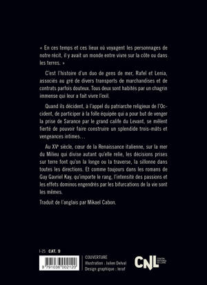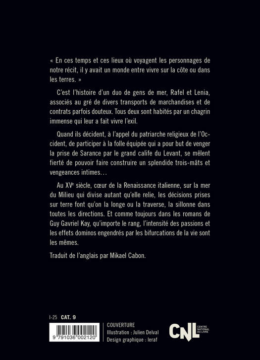 Au XVe siècle, coeur de la Renaissance italienne, sur la mer du Milieu qui divise autant qu'elle relie, les décisions prises sur terre font qu'on la longe ou la traverse, la sillonne dans toutes les directions. Et comme toujours dans les romans de Guy Gavriel Kay, qu'importe le rang, l'intensité des passions et les effets dominos engendrés par les bifurcations de la vie sont les mêmes.