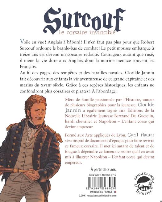 Voile en vue ! Anglais à bâbord ! Il n'en faut pas plus pour que Robert Surcouf ordonne le branle-bas de combat ! Le petit mousse embarqué à treize ans est devenu un corsaire redouté. Courageux autant que rusé, il mène la vie dure aux Anglais dont la marine menace souvent les Français. Au fil des pages, des tempêtes et des batailles navales, Clotilde Jannin fait découvrir aux enfants la vie aventureuse de ce grand capitaine et des marins du XVIIIe siècle. Grâce à ces repères historiques, les enfants ne confondront plus corsaires et pirates ! À l'abordage !