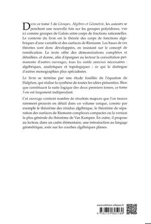 Dans ce tome 3 de Groupes, Algèbres et Géométrie, les auteurs se penchent une nouvelle fois sur les groupes polyédraux, vus ici comme groupes de Galois entre corps de fractions rationnelles. Le contexte du livre est la théorie des corps de fonctions algébriques d'une variable et des surfaces de Riemann. Les bases de ces théories sont donc développées, en insistant sur le concept de ramification. Le texte offre des démonstrations complètes et détaillées, et donne, afin d'épargner au lecteur la consultation permanente d'autres ouvrages, tous les outils annexes nécessaires : algébriques, analytiques et topologiques ; ce qui le distingue d'autres monographies plus spécialisées.