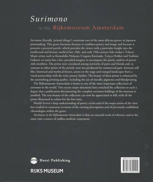 Surimono (literally 'printed things') constitute one of the most delicate genres in Japanese printmaking. This genre fascinates because it combines poetry and image and because it presents a pictorial puzzle, which provides the viewer with a particular insight into the intellectual and literary world of late 18th- and early 19th-century Edo (today's Tokyo). Major artists such as Katsushika Hokusai, Utagawa Kunisada, Totoya Hokkei and Yashima Gakutei, to name but a few, provided imagery to accompany the poetic exploits of poetry club members. The prints were circulated among networks of poets and friends and, in contrast to other prints of the period, were not produced for commercial gain. Intricate still lifes, historical and mythical heroes, actors on the stage and tranquil landscapes form a visual partnership with the witty poems (kyōka). The beauty of these prints is enhanced by the astonishing printing quality, including the use of metallic pigments and blindprinting. The Rijksmuseum Amsterdam is home to one of the most important collections of surimono in the world. Two recent major donations have enriched the collection to such a degree that a publication documenting the complete surimono holdings of the museum is justified. The true beauty of the collection can now be appreciated in full, with all the prints illustrated in colour for the first time. Matthi Forrer's deep understanding of poetry circles and of the major artists of the time has resulted in numerous revisions of the existing descriptions and of previously established chronologies within the genre. Surimono in the Rijksmuseum Amsterdam is thus an essential work of reference and at the same time a source of endless aesthetic enjoyment.
