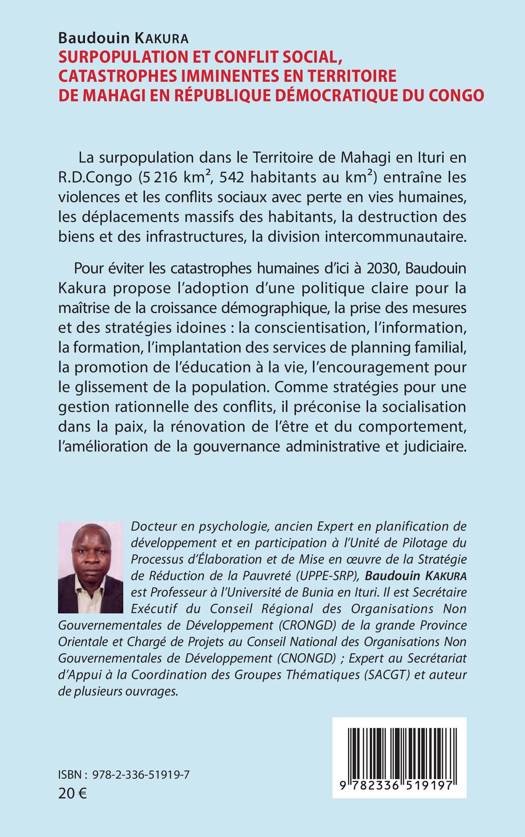 La surpopulation dans le Territoire de Mahagi en Ituri en R.D.Congo ( 5.216 km², 542 habitants au km²) entraîne les violences et les conflits sociaux avec perte en vies humaines, les déplacements massifs des habitants, la destruction des biens et des infrastructures, la division intercommunautaire. Pour éviter les catastrophes humaines d'ici à 2030, Baudouin Kakura propose l'adoption d'une politique claire pour la maîtrise de la croissance démographique, la prise des mesures et des stratégies idoines la conscientisation, l'information, la formation, l'implantation des services de planning familial, la promotion de l'éducation à la vie, l'encouragement pour le glissement de la population. Comme stratégies pour une gestion rationnelle des conflits, il préconise la socialisation dans la paix, la rénovation de l'être et du comportement, l'amélioration de la gouvernance administrative et judiciaire.