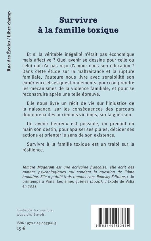 Et si la véritable inégalité n'était pas économique mais affective ? Quel avenir se dessine pour celle ou celui qui n'a pas reçu d'amour dans son éducation ? Dans cette étude sur la maltraitance et la rupture familiale, l'auteure nous livre avec sensibilité son expérience et ses questionnements, pour comprendre les mécanismes de la violence familiale, et pour se reconstruire après une telle épreuve. Elle nous livre un récit de vie sur l'injustice de la naissance, sur les conséquences des parcours douloureux des anciennes victimes, sur la guérison. Un avenir heureux est possible, en prenant en main son destin, pour apaiser ses plaies, décider ses actions et orienter le sens de son existence. Survivre à la famille toxique est un traité sur la résilience.
