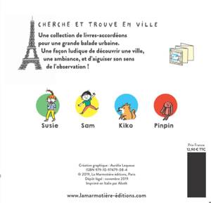 Une collection de livre-accordéon permettant une grande balade urbaine à travers les lieux emblématiques de la ville.<br /> L’enfant s’amuse à observer la scène sous forme de frise et à retrouver Susie, Sam, Kiko et Pinpin ainsi que les différents monuments.<br /><br /> Une façon ludique de découvrir une ville, une ambiance, et d’entraîner sa concentration et son sens de l’observation.