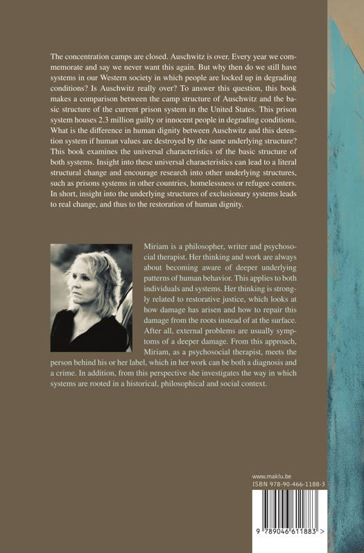 The concentration camps are closed. Auschwitz is over. Every year we commemorate and say we never want this again. But why then do we still have systems in our Western society in which people are locked up in degrading conditions? Is Auschwitz really over? To answer this question, this book makes a comparison between the camp structure of Auschwitz and the basic structure of the current prison system in the United States. This prison system houses 2.3 million guilty or innocent people in degrading conditions. What is the difference in human dignity between Auschwitz and this detention system if human values are destroyed by the same underlying structure? This book examines the universal characteristics of the basic structure of both systems. Insight into these universal characteristics can lead to a literal