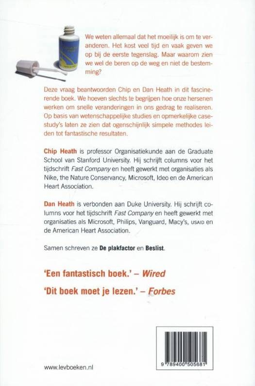 Deze vraag beantwoorden Chip en Dan Heath in dit fascinerende boek. We hoeven slechts te begrijpen hoe onze hersenen werken om snelle veranderingen in ons gedrag te realiseren. Op basis van wetenschappelijke studies en opmerkelijke casestudy’s laten ze zien dat ogenschijnlijk simpele methodes leiden tot fantastische resultaten.