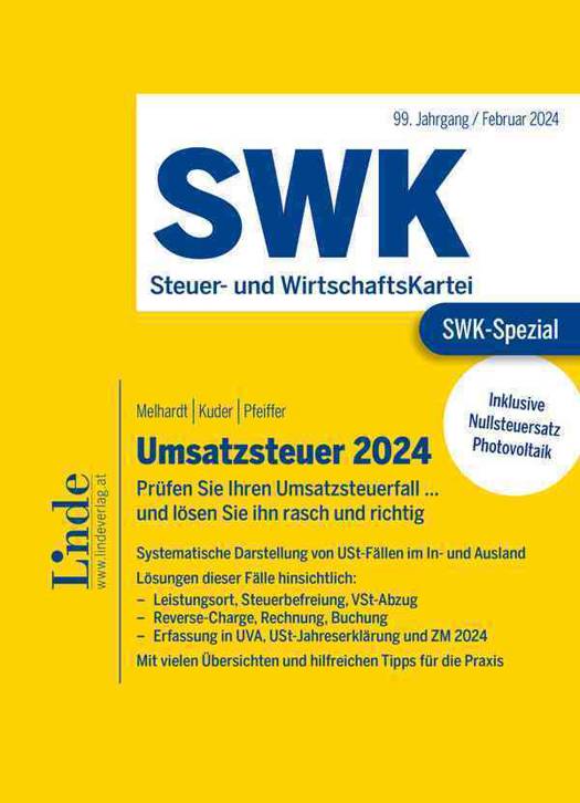 Systematisch stellt das SWK-Spezial in- und ausländische Umsatzsteuer-Fälle dar und löst sie auf dem neuesten Stand. Ihr Umsatzsteuerfall geprüft und gelöst mit dem "SWK-Spezial Umsatzsteuer 2024".