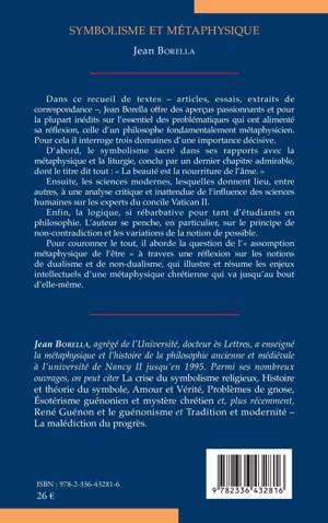 Dans ce recueil de textes, Jean Borella offre des aperçus passionnants et pour la plupart inédits sur l'essentiel des problématiques qui ont alimenté sa réflexion, celle d'un philosophe fondamentalement métaphysicien. Pour cela il interroge trois domaines d'une importance décisive. D'abord, le symbolisme sacré dans ses rapports avec la métaphysique et la liturgie, conclu par un dernier chapitre admirable, dont le titre dit tout: La beauté est la nourriture de l'âme. Ensuite, les sciences modernes, lesquelles donnent lieu, entre autres, à une analyse critique et inattendue de l'influence des sciences humaines sur les experts du concile Vatican II. Enfin, la logique, si rébarbative pour tant d'étudiants en philosophie. L'auteur se penche, en particulier, sur le principe de non-contradiction et les variations de la notion de possible. Pour couronner le tout, il aborde la question de l' assomption métaphysique de l'être à travers une réflexion sur les notions de dualisme et de non-dualisme, qui illustre et résume les enjeux intellectuels d'une métaphysique chrétienne qui va jusqu'au bout d'elle-même.