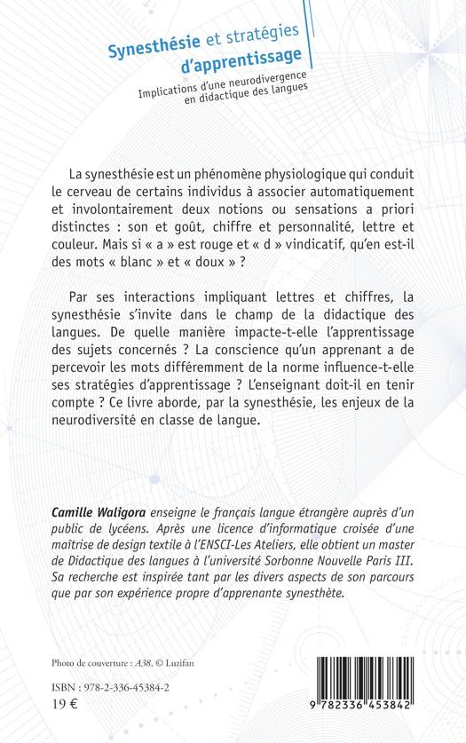 Par ses interactions impliquant lettres et chiffres, la synesthésie s'invite dans le champ de la didactique des langues. De quelle manière impacte-t-elle l'apprentissage des sujets concernés ? La conscience qu'un apprenant a de percevoir les mots différemment de la norme influence-t-elle ses stratégies d'apprentissage ? L'enseignant doit-il en tenir compte ? Ce livre aborde, par la synesthésie, les enjeux de la neurodiversité en classe de langue.