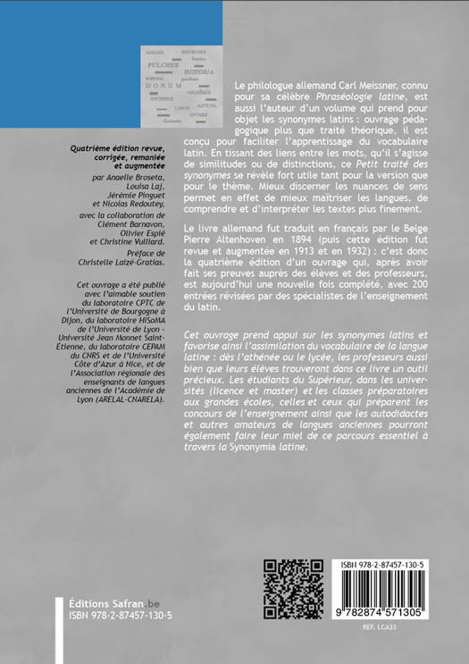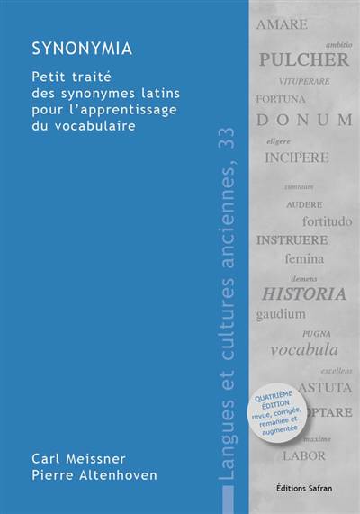Le philologue allemand Carl Meissner (1830–1900), connu pour sa célèbre Phraséologie latine, est aussi l’auteur d’un volume qui prend pour objet les synonymes latins : ouvrage pédagogique plus que traité théorique, il est conçu pour faciliter l’apprentissage du vocabulaire latin. En tissant des liens entre les mots, qu’il s’agisse de similitudes ou de distinctions, ce Petit traité des synonymes se révèle fort utile tant pour la version que pour le thème. Mieux discerner les nuances de sens permet en effet de mieux maîtriser les langues, de comprendre et d’interpréter les textes plus finement.