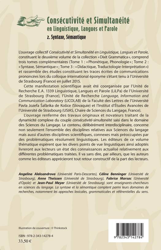 Sont présentés ici des travaux originaux et novateurs traitant de la dynamicité complexe du couple consécutivité-simultanéité saisi dans le domaine des Sciences du Langage. Le contenu, délibérément interdisciplinaire, concerne non seulement l'ensemble des disciplines relatives aux Sciences du langage mais aussi d'autres disciplines scientifiques, connexes mais préoccupées par des problématiques résolument linguistiques.