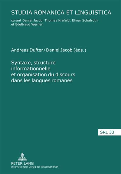 Mettant l'accent sur la structure informationnelle, ce volume invite à reconsidérer des phénomènes situés à cheval entre la syntaxe et l'organisation textuelle, tels que le codage des référents discursifs, les patrons syntaxiques dits « non-canoniques », l'interprétation des relations interpropositionnelles ou la co-construction des énoncés dans le discours oral. Le volume réunit onze contributions écrites en français, en espagnol et en portugais. Haciendo hincapié en la estructura informativa, este volumen invita a reexaminar fenómenos situados a caballo entre la sintaxis y la organización textual, como la realización morfosintáctica de los referentes discursivos, los patrones sintácticos llamados «no canónicos», la interpretación de las relaciones inter-proposicionales o la co-construcción de los enunciados en el discurso oral. El volumen contiene contribuciones en francés, en español y en portugués.