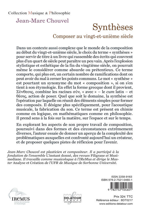 Dans un contexte aussi complexe que le monde de la composition au début du vingt-et-unième siècle, le choix du terme « synthèses » pour servir de titre à un livre qui rassemble des écrits qui couvrent plus d’un quart de siècle peut paraître un peu vain. Après l’explosion stylistique et esthétique de la fin du vingtième siècle, on pourrait même le considérer comme absurde ou prétentieux. Ce terme comporte, qui plus est, un certain nombre de ramifications dont on peut avoir du mal à cerner les points communs. Le mot « synthèse » est pourtant un synonyme du mot « composition », si on s’en tient à son étymologie. En effet la forme grecque dont il provient, Σύνθεσις, combine les racines σύν, « avec » – le cum latin – et θέσις, action de poser. Quel que soit le domaine, la synthèse est l’opération par laquelle on réunit des éléments simples pour former des composés. Il désigne plus spécifiquement, pour l’acoustique musicale, la fabrication du son. Ce terme est présent en chimie comme en logique, en mathématiques comme en philosophie. Il prend sens à la fois sur la matière, sur l’espace et sur le temps. En explorant les aspects de son propre travail de composition, poursuivi dans des formes et des circonstances extrêmement diverses, l’auteur essaie de donner un aperçu de la complexité des problématiques auxquelles est confronté aujourd’hui un créateur, et de proposer quelques pistes de réflexion pour l’avenir.