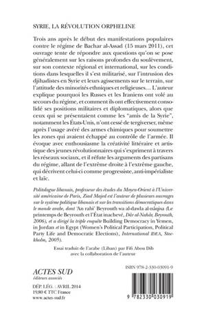 Trois ans après le début des manifestations populaires contre le régime de Bachar al-Assad (15 mars 2011), cet ouvrage tente de répondre aux questions qu'on se pose généralement sur les raisons profondes du soulèvement, sur son contexte régional et international, sur les conditions dans lesquelles il s'est militarisé, sur l'intrusion des djihadistes en Syrie et leurs agissements sur le terrain, sur l'attitude des minorités ethniques et religieuses... L'auteur explique pourquoi les Russes et les Iraniens ont volé au secours du régime, et comment ils ont effectivement consolidé ses positions militaires et diplomatiques, alors que ceux qui se présentaient comme les "amis de la Syrie", notamment les États-Unis, n'ont cessé de tergiverser, même après l'usage avéré des armes chimiques pour soumettre les zones qui avaient échappé au contrôle de l'armée. Il évoque avec enthousiasme la créativité littéraire et artistique des jeunes révolutionnaires qui s'expriment à travers les réseaux sociaux, et il réfute les arguments des partisans du régime, allant de l'extrême droite à l'extrême gauche, qui décrivent celui-ci comme progressiste, anti-impérialiste et laïc.
