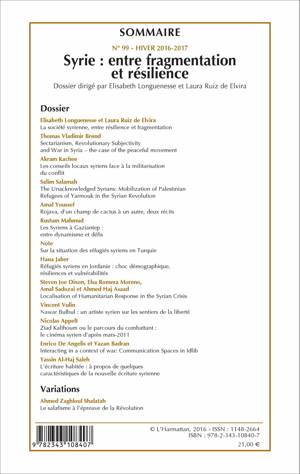 Le parti-pris de ce numéro de Confluences Méditerranée est de refuser les discours médiatiques qui tendent à réduire le "conflit syrien" à deux parties, ou au mieux trois : le régime, l'"Etat Islamique" et les Kurdes, en oubliant les Syriens, réduits à un ensemble indifférencié de victimes de la violence d'un régime criminel d'un côté, de la barbarie jihadiste de l'autre. L'objectif est d'apporter un éclairage sur ce que vivent les Syriens depuis 2011, ce qu'ils font et inventent comme modes d'organisation, de communication et d'expression, en laissant un instant de côté les enjeux géopolitiques du conflit.
