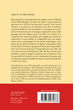 Dans la poésie contemporaine de langue arabe, le Kurde syrien Salim Barakat occupe une place à part depuis la parution en 1973 de son premier recueil, «Tout venant clamera en ma faveur et tout partant aussi». Par la richesse exceptionnelle de son vocabulaire, ses fougueuses sonorités et la luxuriance de ses images, empruntées aux rudes paysages de son village natal, à sa flore et sa faune, il a construit une oeuvre poétique qui compte pas moins de vingt titres, et qui rivalise en originalité avec son imposante oeuvre romanesque. Cette petite anthologie, composée par le poète lui-même et puisée notamment dans ses derniers recueils, se propose d'offrir pour la première fois aux lecteurs français et francophones une idée de cette foisonnante production. Elle décline autant que possible en peu de pages la gamme de ses thèmes et de ses procédés d'écriture en une traduction française qui constituait un pari fort difficile à tenir et qu'Antoine Jockey a relevé avec brio.