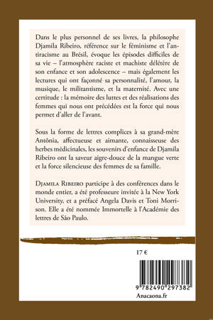 Dans le plus personnel de ses livres, la philosophe Djamila Ribeiro, référence sur le féminisme et l'antiracisme au Brésil, évoque les épisodes difficiles de sa vie – l'atmosphère raciste et machiste délétère de son enfance et son adolescence – mais également les lectures qui ont façonné sa personnalité, l'amour, la musique, le militantisme, et la maternité. Avec une certitude : la mémoire des luttes et des réalisations des femmes qui nous ont précédées est la force qui nous permet d'aller de l'avant. Sous la forme de lettres complices à sa grand-mère Antônia, affectueuse et aimante, connaisseuse des herbes médicinales, les souvenirs d'enfance de Djamila Ribeiro ont la saveur aigre-douce de la mangue verte et la force silencieuse des femmes de sa famille. Djamila Ribeiro participe à des conférences dans le monde entier, a été professeure invitée à la New York University, et a préfacé Angela Davis et Toni Morrison. Elle a été nommée Immortelle à l'Académie des lettres de São Paulo.