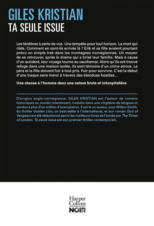À propos de l’auteur D’origine anglo-norvégienne, Giles Kristian est l’auteur de romans historiques au succès retentissant, traduits dans une vingtaine de langues et vendus à plus d’un million d’exemplaires. Il est le co-auteur, avec Wilbur Smith, du thriller Golden Lion, un best-seller à l’international, et son roman God of Vengeance a été sélectionné parmi les meilleurs livres de l’année par The Times of London. Ta seule issue est son premier thriller contemporain.