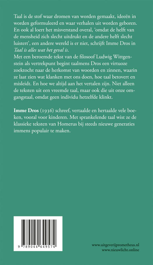 Taal is de stof waar dromen van worden gemaakt, ideeën in worden geformuleerd en waar verhalen uit worden geboren. En ook al loert het misverstand overal, ‘omdat de helft van de mensheid zich slecht uitdrukt en de andere helft slecht luistert’, een andere wereld is er niet, schrijft Imme Dros in Taal is alles wat het geval is.