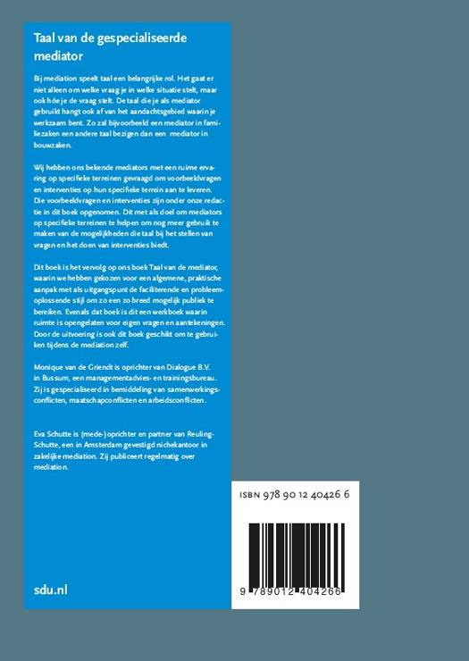 Dit boek is het vervolg op ons boek Taal van de mediator, waarin we hebben gekozen voor een algemene, praktische aanpak met als uitgangspunt de faciliterende en probleemoplossende stijl om zo een zo breed mogelijk publiek te bereiken. Evenals dat boek is dit een werkboek waarin ruimte is opengelaten voor eigen vragen en aantekeningen. Door de uitvoering is ook dit boek geschikt om te gebruiken tijdens de mediation zelf.
