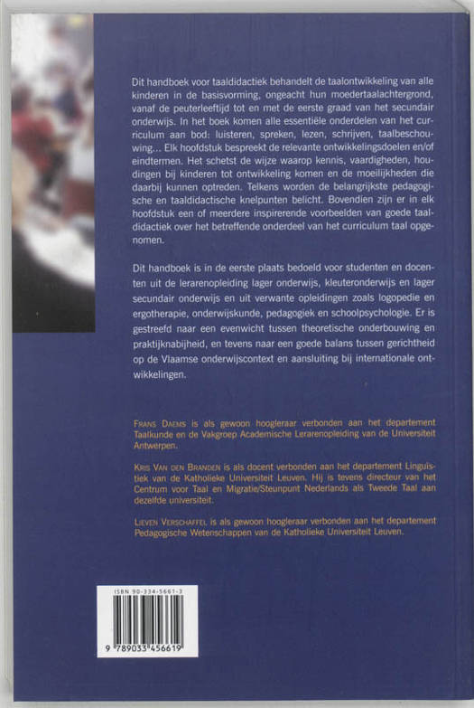 Dit handboek voor taaldidactiek behandelt de taalontwikkeling van alle kinderen in de basisvorming, ongeacht hun moedertaalachtergrond, vanaf de peuterleeftijd tot en met de eerste graad van het secundair onderwijs. In het boek komen alle essentiële onderdelen van het curriculum aan bod: luisteren, spreken, lezen, schrijven, taalbeschouwing... Elk hoofdstuk bespreekt de relevante ontwikkelingsdoelen en/of eindtermen. Het schetst de wijze waarop de kennis, vaardigheden, houdingen bij kinderen tot ontwikkeling komen en de moeilijkheden die daarbij kunnen optreden. Telkens worden de belangrijkste pedagogische en taaldidactische knelpunten belicht. Bovendien zijn er in elk hoofdstuk één of meerdere inspirerende voorbeelden van goede taaldidactiek over het betreffende onderdeel van het curriculum taal opgenomen. Dit handboek is in de eerste plaats bedoeld voor studenten en docenten uit de lerarenopleiding lager onderwijs, kleuteronderwijs en lager secundair onderwijs en uit verwante opleidingen zoals logopedie en ergotherapie, onderwijskunde, pedagogiek en schoolpsychologie. Er is gestreefd naar een evenwicht tussen theoretische onderbouwing en praktijknabijheid, en tevens naar een goede balans tussen gerichtheid op de Vlaamse onderwijscontext en aansluiting bij internationale ontwikkelingen.