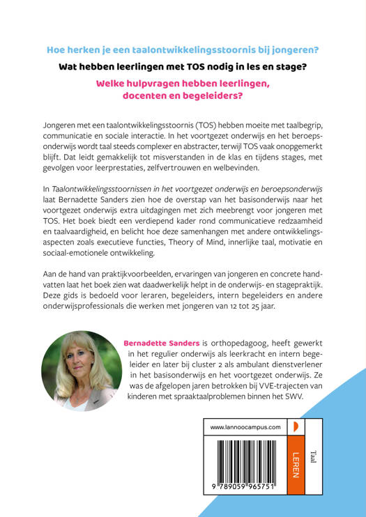 Hoe herken je een taalontwikkelingsstoornis bij jongeren? Wat hebben leerlingen met TOS nodig in les en stage? Welke hulpvragen hebben leerlingen, docenten en begeleiders? Jongeren met een taalontwikkelingsstoornis (TOS) hebben moeite met taalbegrip, communicatie en sociale interactie. In het voortgezet onderwijs en het beroepsonderwijs wordt taal steeds complexer en abstracter, terwijl TOS vaak onopgemerkt blijft. Dat leidt gemakkelijk tot misverstanden in de klas en tijdens stages, met gevolgen voor leerprestaties, zelfvertrouwen en welbevinden. In Taalontwikkelingsstoornissen in het voortgezet onderwijs en beroepsonderwijs laat Bernadette Sanders zien hoe de overstap van het basisonderwijs naar het voortgezet onderwijs extra uitdagingen met zich meebrengt voor jongeren met TOS. Het boek biedt een verdiepend kader rond communicatieve redzaamheid en taalvaardigheid, en belicht hoe deze samenhangen met andere ontwikkelingsaspecten zoals executieve functies, Theory of Mind, innerlijke taal, motivatie en sociaal-emotionele ontwikkeling. Aan de hand van praktijkvoorbeelden, ervaringen van jongeren en concrete handvatten laat het boek zien wat daadwerkelijk helpt in de onderwijs- en stagepraktijk. Deze gids is bedoeld voor leraren, begeleiders, intern begeleiders en andere onderwijsprofessionals die werken met jongeren van 12 tot 25 jaar.