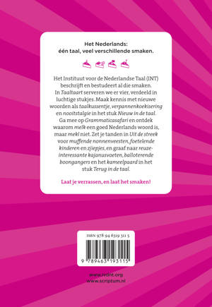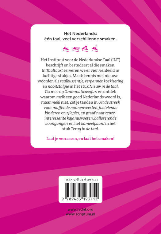 Het Instituut voor de Nederlandse Taal (INT) beschrijft en bestudeert al die smaken. In Taaltaart serveren we er vier, verdeeld in luchtige stukjes. Maak kennis met nieuwe woorden als taalkussentje, verpannenkoekisering en nooitstalgie in het stuk Nieuw in de taal. Ga mee op Grammaticasafari en ontdek waarom melk een goed Nederlands woord is, maar mekl niet. Zet je tanden in Uit de streek voor muffende nonnenveesten, foetelende kinderen en zjiepjes. En graaf naar reuzeinteressante kajanusvoeten, balloterende boongangers en het kameelpaard in het stuk Terug in de taal. Laat je verrassen, en laat het smaken!