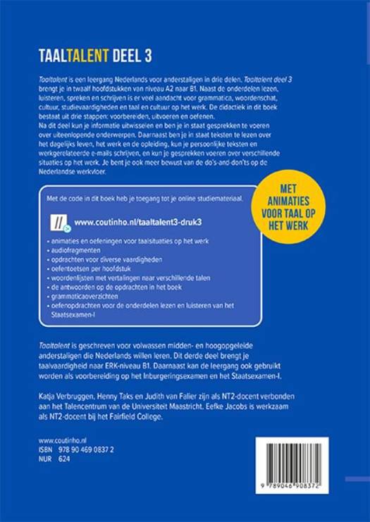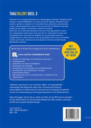 Taaltalent is geschreven voor volwassen midden- en hoogopgeleide anderstaligen die Nederlands willen leren. Dit derde deel brengt je taalvaardigheid naar ERK-niveau B1. Daarnaast kan de leergang ook gebruikt worden als voorbereiding op het Inburgeringsexamen en het Staatsexamen, programma I.