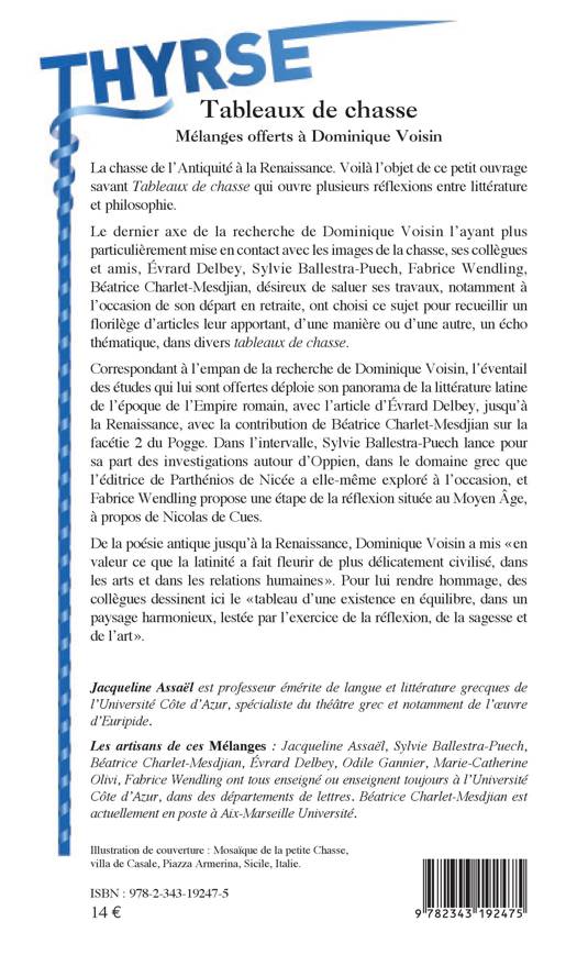 La chasse de l'Antiquité à la Renaissance. Voilà l'objet de cet ouvrage savant Tableaux de chasse qui ouvre plusieurs réflexions entre littérature et philosophie. De la poésie antique jusqu'à la Renaissance, Dominique Voisin a mis « en valeur ce que la latinité a fait fleurir de plus délicatement civilisé, dans les arts et dans les relations humaines ». Pour lui rendre hommage, des collègues dessinent ici le « tableau d'une existence en équilibre, dans un paysage harmonieux, lestée par l'exercice de la réflexion, de la sagesse et de l'art ».
