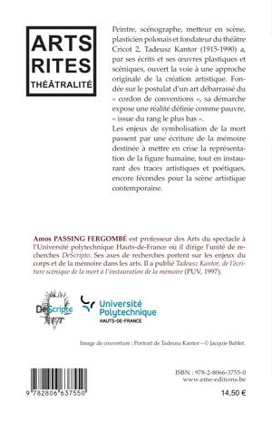 Peintre, scénographe, metteur en scène, plasticien polonais et fondateur du théâtre Cricot 2, Tadeusz Kantor (1915-1990) a, par ses écrits et ses oeuvres plastiques et scéniques, ouvert la voie à une approche originale de la création artistique. Les enjeux de symbolisation de la mort passent par une écriture mettant en crise la représentation de la figure humaine. Il s'agit de saisir la mémoire, des traces artistiques et poétiques fécondes pour la scène artistique contemporaine.