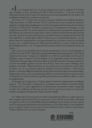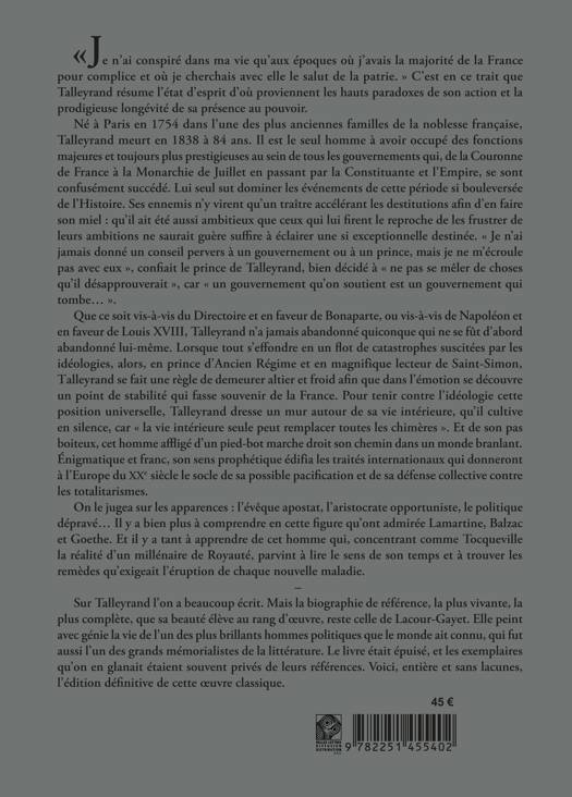 Je n'ai conspire dans ma vie qu'aux epoques ou j'avais la majorite de la France pour complice et ou je cherchais avec elle le salut de la patrie. C'est en ce trait que Talleyrand resume l'etat d'esprit d'ou proviennent les hauts paradoxes de son action et la prodigieuse longevite de sa presence au pouvoir. Ne a Paris en 1754 dans l'une des plus anciennes familles de la noblesse francaise, Talleyrand meurt en 1838 a 84 ans. Il est le seul homme a avoir occupe des fonctions majeures et toujours plus prestigieuses au sein de tous les gouvernements qui, de la Couronne de France a la Monarchie de Juillet en passant par la Constituante et l'Empire, se sont confusement succede. Lui seul sut dominer les evenements de cette periode si bouleversee de l'Histoire. Ses ennemis n'y virent qu'un traitre accelerant les destitutions afin d'en faire son miel: qu'il ait ete aussi ambitieux que ceux qui lui firent le reproche de les frustrer de leurs ambitions ne saurait guere suffire a eclairer une si exceptionnelle destinee. Je n'ai jamais donne un conseil pervers a un gouvernement ou a un prince, mais je ne m'ecroule pas avec eux , confiait le prince de Talleyrand, bien decide a ne pas se meler de choses qu'il desapprouverait , car un gouvernement qu'on soutient est un gouvernement qui tombe... . Que ce soit vis-a-vis du Directoire et en faveur de Bonaparte, ou vis-a-vis de Napoleon et en faveur de Louis XVIII, Talleyrand n'a jamais abandonne quiconque qui ne se fut d'abord abandonne lui-meme. Lorsque tout s'effondre en un flot de catastrophes suscitees par les ideologies, alors, en prince d'Ancien Regime et en magnifique lecteur de Saint-Simon, Talleyrand se fait une regle de demeurer altier et froid afin que dans l'emotion se decouvre un point de stabilite qui fasse souvenir de la France. Pour tenir contre l'ideologie cette position universelle, Talleyrand dresse un mur autour de sa vie interieure, qu'il cultive en silence, car la vie interieure seule peut remplacer toutes les chimeres . Et de son pas boiteux, cet homme afflige d'un pied-bot marche droit son chemin dans un monde branlant. Enigmatique et franc, son sens prophetique edifia les traites internationaux qui donneront a l'Europe du XXe siecle le socle de sa possible pacification et de sa defense collective contre les totalitarismes. On le jugea sur les apparences: l'eveque apostat, l'aristocrate opportuniste, le politique deprave... Il y a bien plus a comprendre en cette figure qu'ont admiree Lamartine, Balzac et Goethe. Et il y a tant a apprendre de cet homme qui, concentrant comme Tocqueville la realite d'un millenaire de Royaute, parvint a lire le sens de son temps et a trouver les remedes qu'exigeait l'eruption de chaque nouvelle maladie. Sur Talleyrand l'on a beaucoup ecrit. Mais la biographie de reference, la plus vivante, la plus complete, que sa beaute eleve au rang d'oeuvre, reste celle de Lacour-Gayet. Elle peint avec genie la vie de l'un des plus brillants hommes politiques que le monde ait connu, qui fut aussi l'un des grands memorialistes de la litterature. Le livre etait epuise, et les exemplaires qu'on en glanait etaient souvent prives de leurs references. Voici, entiere et sans lacunes, l'edition definitive de cette oeuvre classique.