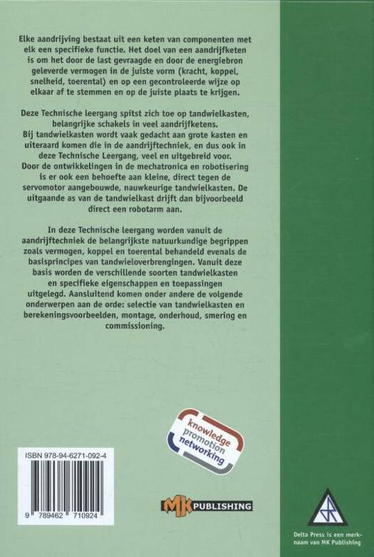 Inhoud: - De aandrijfketen - Tandwieloverbrengingen - Tandwielkasten, rechte en haakse overbrengingen - Rechte en haakse vlakke tandwielkasten - Rechte en haakse planetaire tandwielkasten - Wormkasten - Motorreductoren - Overige tandwielksaten - Smering van tandwielkasten - Techniek, onderhoud, montage en inbedrijfstelling van tandwielkasten - Selectie van tandwielkasten