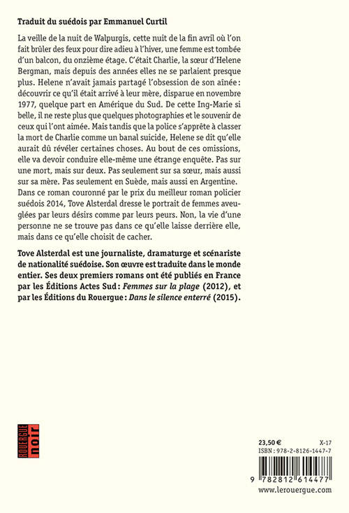 Durant la nuit de Walpurgis, cette nuit de la fin avril où l'on fait brûler des feux pour dire adieu à l'hiver, une femme est tombée d'un balcon, du onzième étage. C'était Charlie, la soeur d'Helene Bergman, mais depuis des années elles ne se parlaient presque plus. Helene n'avait jamais partagé l'obsession de son aînée : découvrir ce qu'il était arrivé à leur mère, disparue en novembre 1977, quelque part en Amérique du Sud. De cette Ing-Marie si belle, il ne reste plus que quelques photographies et le souvenir de ceux qui l'ont aimée. Mais tandis que la police s'apprête à classer la mort de Charlie comme un banal suicide, Helene se dit qu'elle aurait dû révéler certaines choses. Au bout de ces omissions, elle va devoir conduire elle-même une étrange enquête. Pas sur une mort, mais sur deux. Pas seulement sur sa soeur, mais aussi sur sa mère. Pas seulement en Suède, mais aussi en Argentine. Dans ce roman couronné par le prix du meilleur roman policier suédois 2014, Tove Alsterdal dresse le portrait de femmes aveuglées par leurs désirs comme par leurs peurs. Non, la vie d'une personne ne se trouve pas dans ce qu'elle laisse derrière elle, mais dans ce qu'elle choisit de cacher.