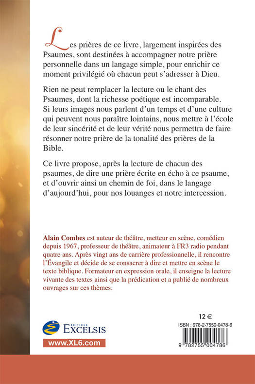 Les prières de ce livre, largement inspirées des Psaumes, sont destinées à accompagner notre prière personnelle dans un langage simple, pour enrichir ce moment privilégié où chacun peut s’adresser à Dieu. Rien ne peut remplacer la lecture ou le chant des Psaumes, dont la richesse poétique est incomparable. Si leurs images nous parlent d’un temps et d’une culture qui peuvent nous paraître lointains, nous mettre à l’école de leur sincérité et de leur vérité nous permettra de faire résonner notre prière de la tonalité des prières de la Bible. Ce livre propose, après la lecture de chacun des psaumes, de dire une prière écrite en écho à ce psaume, et d’ouvrir ainsi un chemin de foi, dans le langage d’aujourd’hui, pour nos louanges et notre intercession.